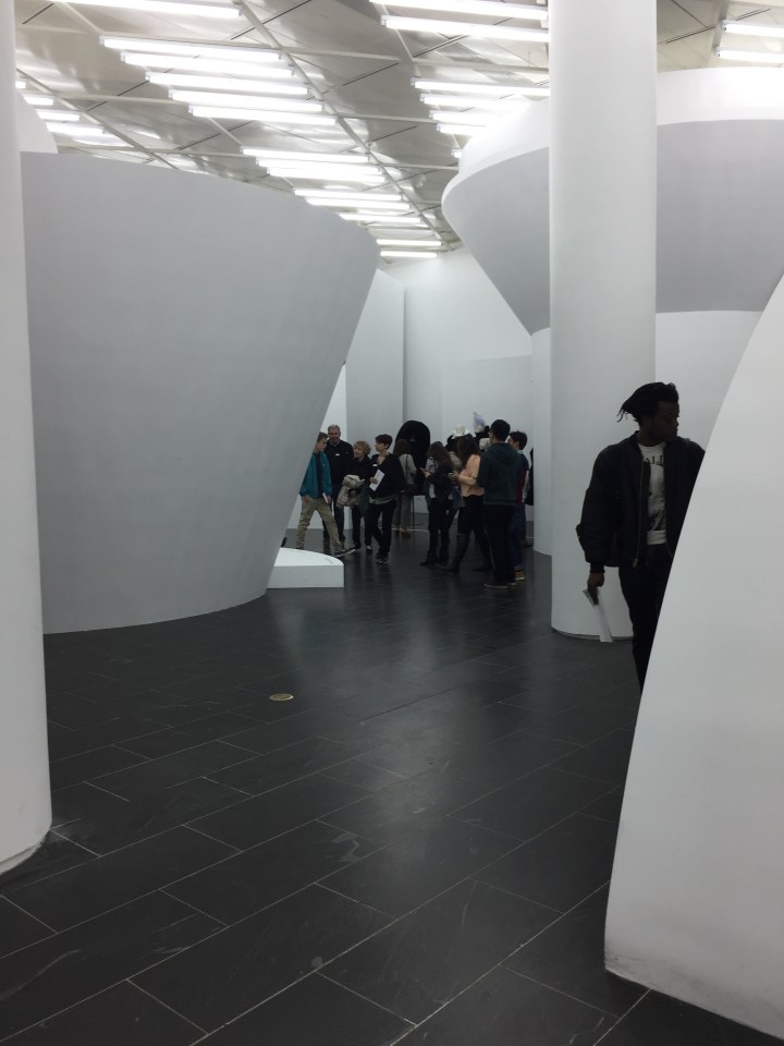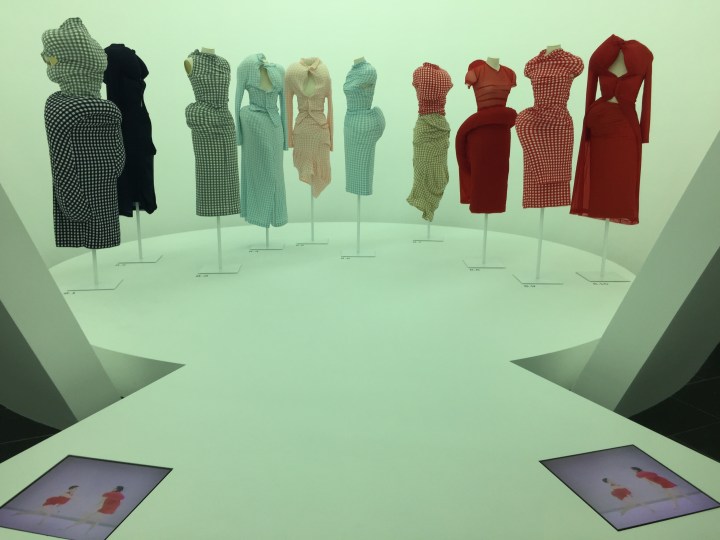 会場は、広大なメトロポリタンの中の特別会場、ミュージアムのなあkにもう一つのミュージアムというか、展示会場自体が、コンテンポラリー作品のよう。天井の無数の蛍光灯の下に、いくつもの真っ白い巨大ドームがずらり。その中に服がディスプレーされています。1981年パリコレデビュー以来、現在までの140点の作品が次々に現れます。