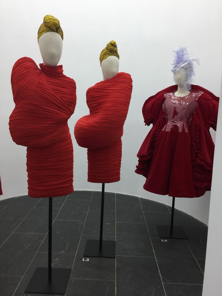 まず目に飛び込んでくるのが、真っ赤な布をボディにミイラのように巻きつけたドレス、肩や腰がデフォルメされて飛び出しているのが特色です。