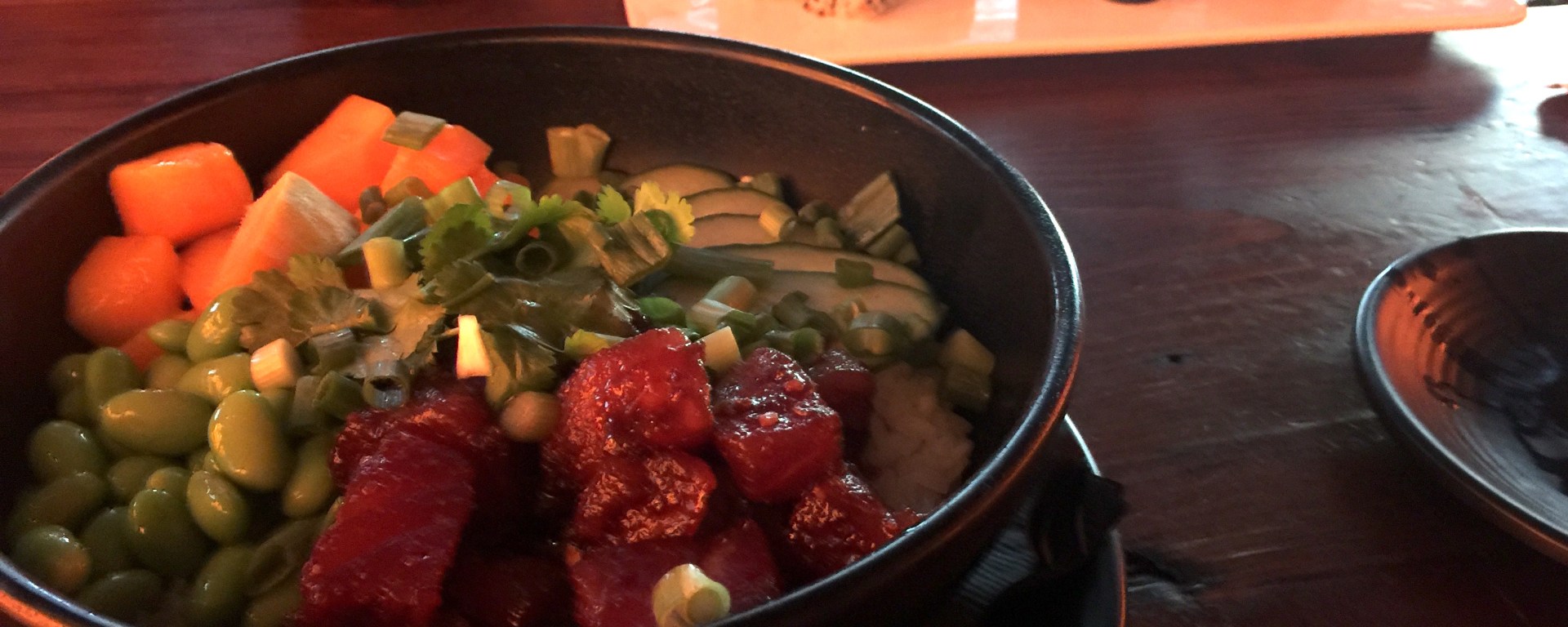 以前丼ブームでもお伝えした、ハワイアンスタイルのチラシ寿司がポケ。お醤油やゴマ油、タバスコソースなどで、ちょっとスパイシーに味付けしたマグロやサーモンに、エダマメやマンゴーがのっていてトロピカル。