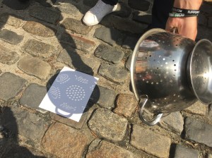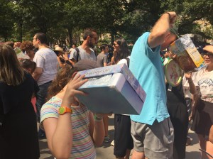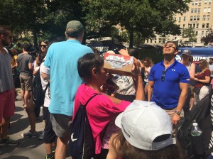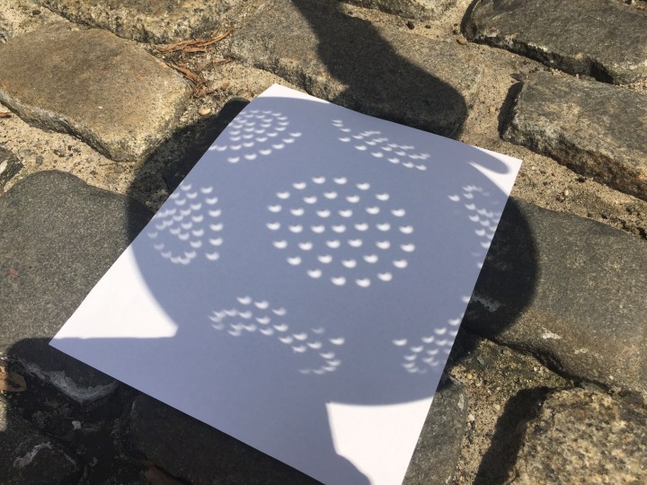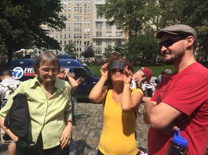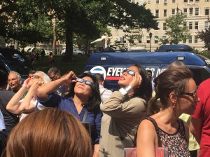 私はNASAが指定したビューイング・スポットの一つ、アメリカ自然史博物館のプラネタリウムの前の公園に行ってみました。太陽が7割欠ける午後2時半頃には数百人の人でぎっしり。ソーラーメガネで見ている人もいたけれど、品薄のため買えない人が続出。代わりに手作りの日食ビューワーを持ってきている人が多かった。シリアルの箱や靴の箱などに小さな穴を開けて、日光カメラの要領で中に写っているのを見るんです。