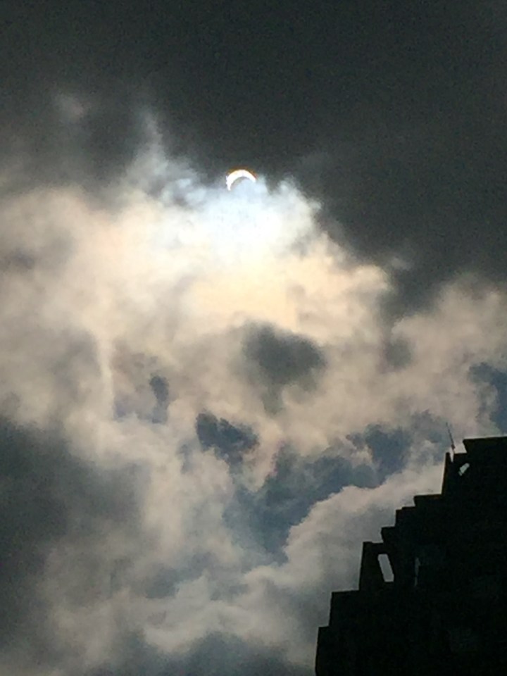 アメリカは広いので、何年かに一度大陸のどこかで皆既日食が起こっているので、日食自体そこまで珍しいものではない。ところが今回のは、皆既日食が地球の自転コースに沿って、アメリカ大陸の西から東へ移動していくという非常に珍しいパターンで、実に99年ぶり。アメリカにいればどこかで見えた、ニューヨークでは7割程度の欠け方でした。