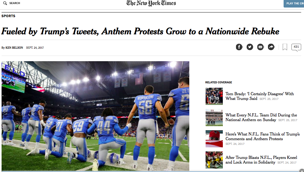 ところがちょうど一年前にある黒人選手コリン・カパーニックが、国歌の時に膝まづいた。その行為には、黒人に対する、警察の行き過ぎた暴力に抗議するメッセージが込められていた。それに対し、スポーツに政治を持ち込むのはどうだろう?と批判があったが、メッセージ自体には同情的な意見も多かった。どちらにせよ、そこまで大きな論争にはならなかった。