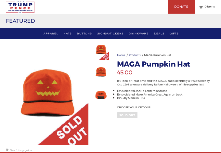 トランプのおなじみのキャップといえば、赤いMake America Great Againという帽子が有名これをハロウィーン仕様にしたというか、オレンジのカボチャ色で、文字の代わりにジャックオーランタンの顔がついている。値段は$45で(高い!)昨日発売と同時にあっという間にソールドアウトしたようです。