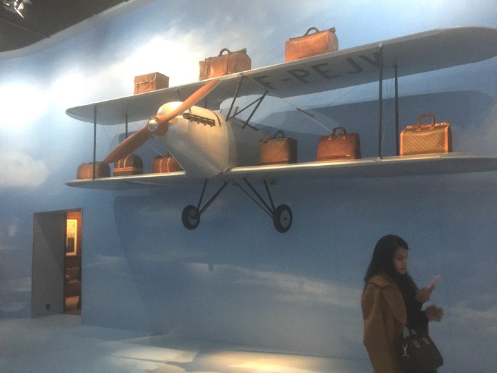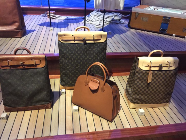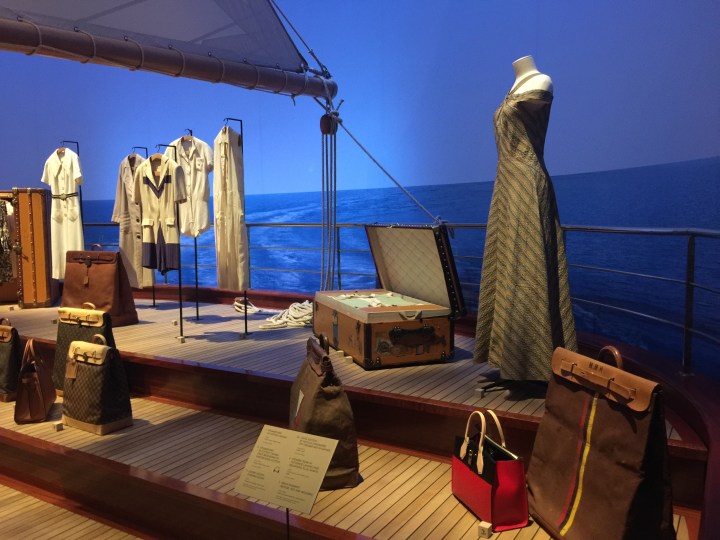 最初は船、吹き抜けるほど高い天井の展示室にはヨットの帆が張られ、デッキの向こうには海のパノラマが。そこにトランクと、1920年代当時画期的だったキャンバスのバッグ、スチーマー・バッグが並び、まるでその世界に入ってしまったよう。