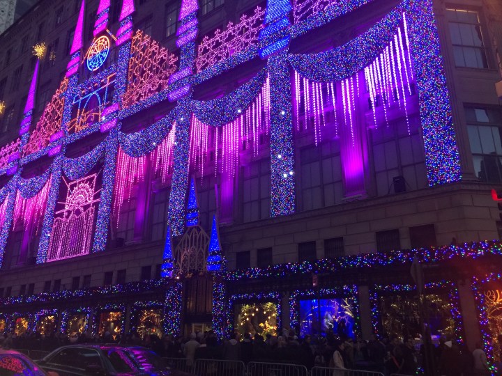 実はこのSaks Fifth Avenueがすごいのはウィンドーだけではない。ウィンドーの上、建物の外壁で3Dプロジェクション・マッピングのショーもある。15分に1回 ビルの壁にお城が現れて、音楽に合わせてあらゆる色に変わりながらキラキラと輝く。