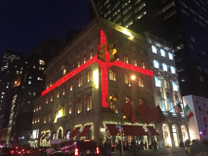 そしてティファニーからカルティエからフェラガモからあらゆるブランドのショップが建物ごとキラキラ・ディスプレーがされている。カルティエは毎年定番、建物に輝く赤いリボンがかかっているようなイルミネーション。歩いているだけでロマンチックな気分に!