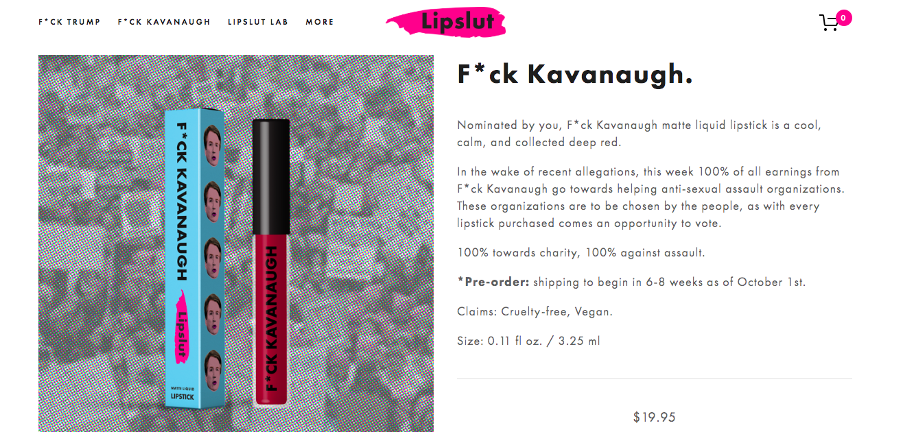 例えばカヴァノー怒る女性たちが出したリップスティックがちょっとした話題になりました。Lipslutという新しいコスメブランド。これまでにもF*ck Trumpというリップスティックを出していましたが、このほどF*ck Kavanaghをローンチ。秋らしいディープでマットな、怒りに燃えたレッド?売り上げの100%は性的暴力の犠牲者を救済するNPOに寄付されます。