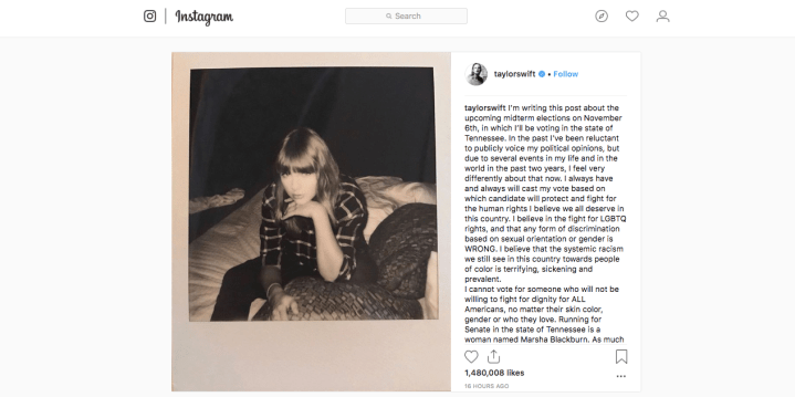自身のインスタで、初めて自分の政治的なスタンスを表明して「あのテイラーが!?」とニュースになりました。