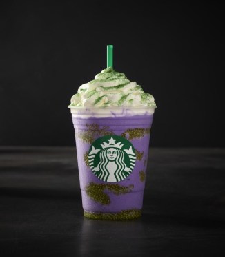 蛍光パープルのドリンクに、トップのホイップクリームにはグリーンの魔法の粉がかかっておどろおどろしさ満点。今朝から発売でこれからインスタに溢れそう。