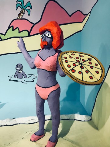 次の部屋はピザ・ビーチ。砂の上に立ってコミカルなビキニギャルの彫刻(もちろんピザを持っている)の隣でパチリ。