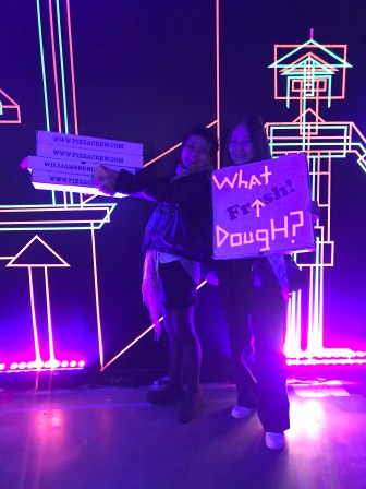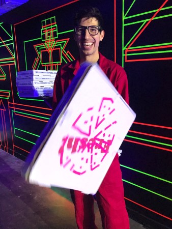 でも次の部屋に入った瞬間に、もう意味がわからなくなる。明かりを落とした部屋の壁にはブラックライトが当たっている。何人もいるスタッフのお兄さんの1人が蛍光塗料でイラストが描かれたピザの箱を持って来て、「はいこれ持って、僕が写真を撮ってあげるから。」