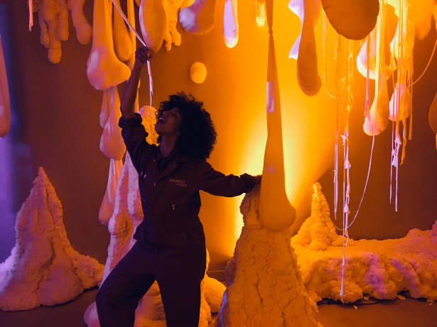 次の部屋は天井からモッツァレラチーズを形取った白い布が鍾乳洞のように垂れ下がっていて、ここでもスタッフのお姉さんが「はいポーズとって」
