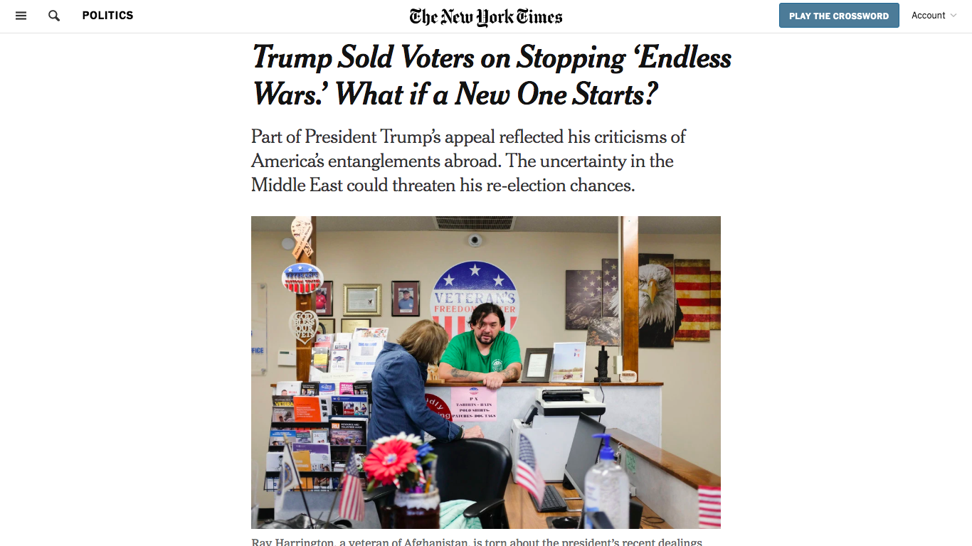 NY Timesは今朝の電子版の記事で、トランプ大統領とイランとの衝突は再選にマイナス。その理由はトランプ氏は2016年の公約の中で、海外への介入特に中東での長引く戦争をやめ、そのお金やエネルギーを国内の経済発展に向けるとしている。今回のイランはその約束を破り、戦争にうんざりしている国民の心理を逆撫でするものだから、としています。