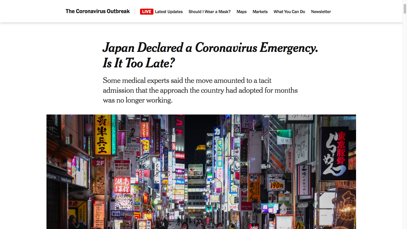 ところがもっと厳しい論調を乗せているのはニューヨークタイムス。この緊急事態宣言は手遅れではないかというヘッドライン