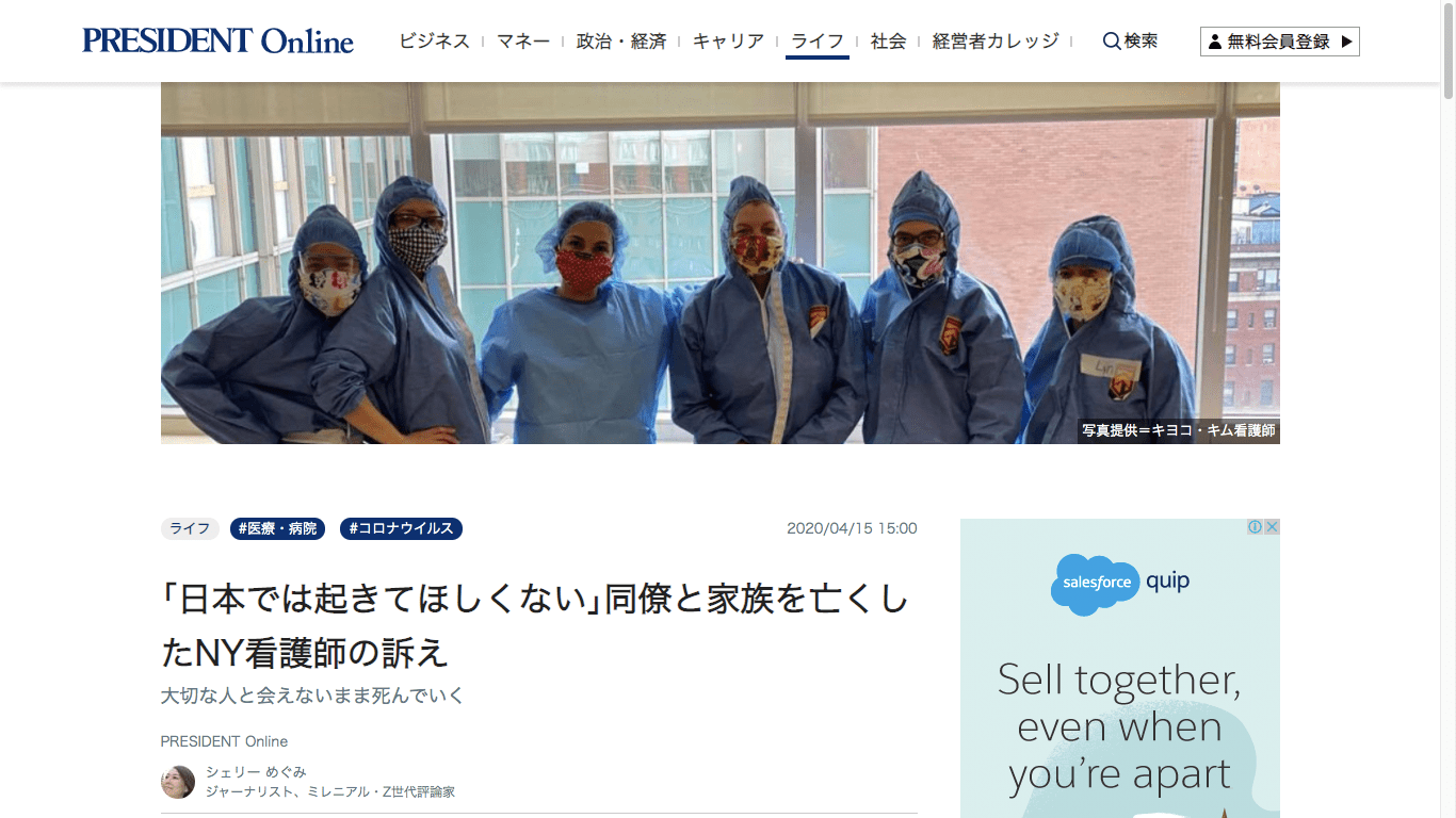 彼女との数週間にわたるテキストの交換と電話での会話を元に、医療崩壊とは本当はどういうものなのか、日本の人に知ってもらいたい。日本がそうならないようにと祈るような気持ちで記事を書いて、プレジデントオンラインというウェブメディアに先週水曜日に出ました。