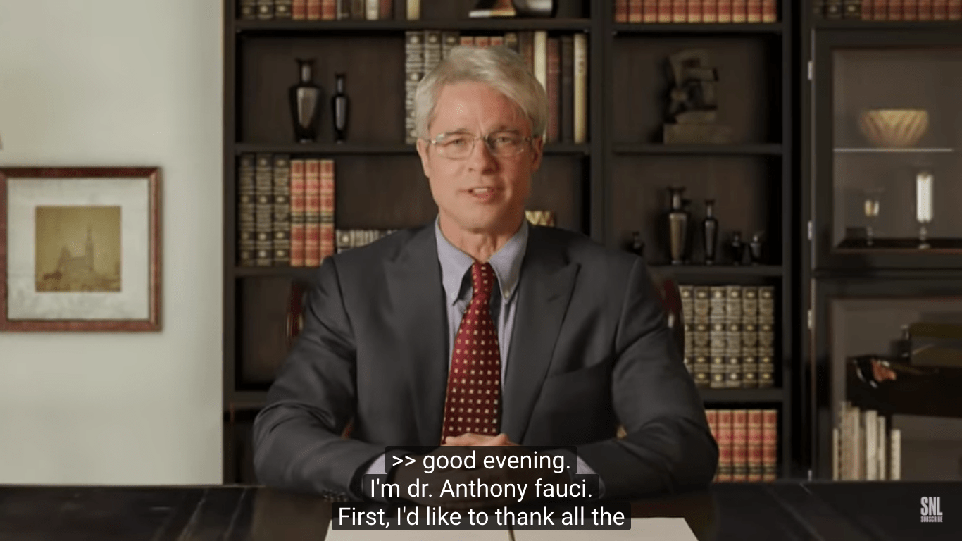 実はこれはファウチ博士の直々のご指名、というかインタビューで俳優が自分を演じるとしたら誰にやって欲しい?と聞かれて、もちろんブラッド・ピットと言ったそう。