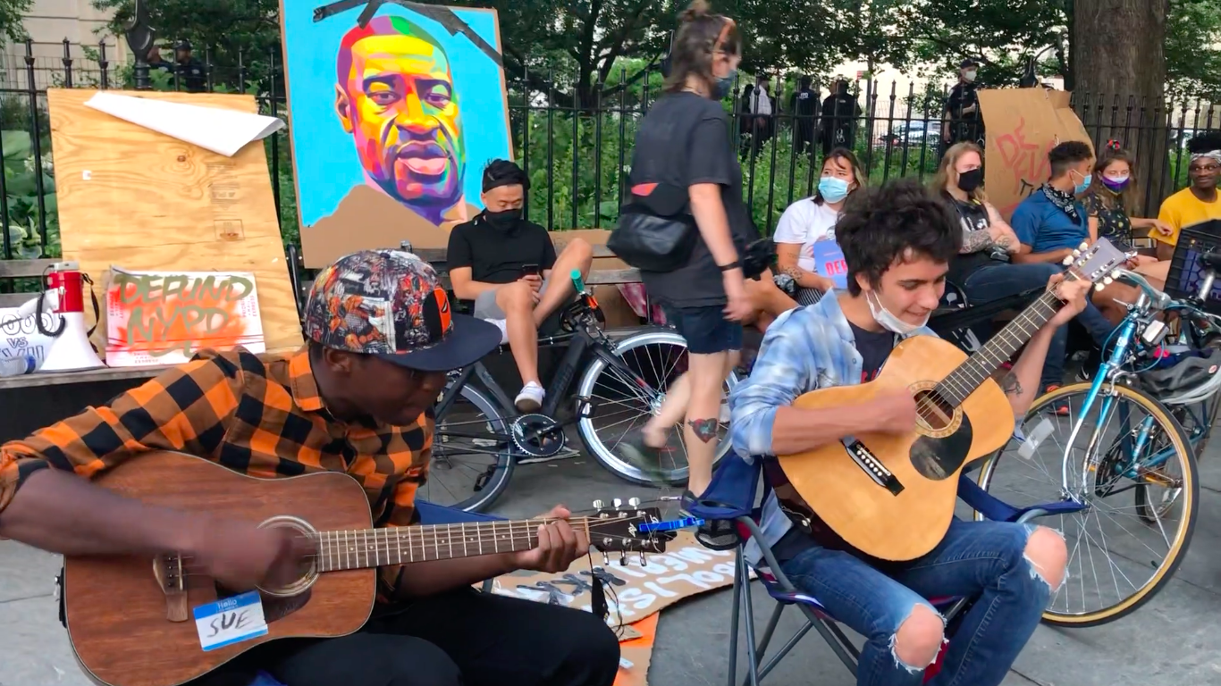 ギターの弾き語りで歌ったり、(上のfacebookに上がっているビデオでは、黒人と白人の男性がデュオで1960年代のプロテストソング、I Shall Be Releasedを歌っています)9年前のOccupy Wall Street(ウォール・ストリートを占拠せよ運動)を思い出させますが、男性が多かった当時に比べ、今回は20代の白人女性のアライ(協力者)が圧倒的で、水や食べ物の支給から、簡易トイレやシャワー 、WIFIまで整い、こうした設備の管理もボランティアが24時間交代制できちんとやっています。