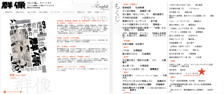 さてもう一つ、ここで私から個人的なお知らせ。今発売中の文芸誌「群像」9月号は、やはり戦争をテーマにしていて、著名人、知識人の作品が満載ですが、その中で私は人種偏見に関する短い随筆を書いています。ご興味あれば是非。http://gunzo.kodansha.co.jp