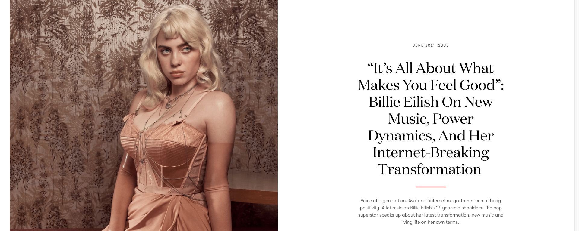 そしてこのタイミングで世界を駆け巡っているニュースが、ファッション誌ブリティッシュ・ヴォーグの表紙になったビリー・アイリッシュ。
