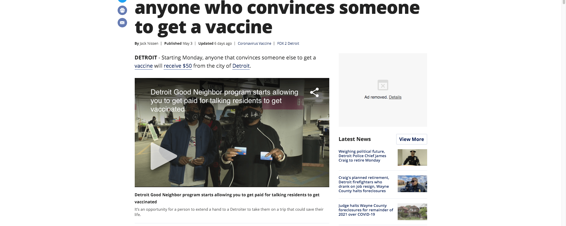 デトロイトでは誰かを説得して接種させれば1人につき50ドルのギフトカード。