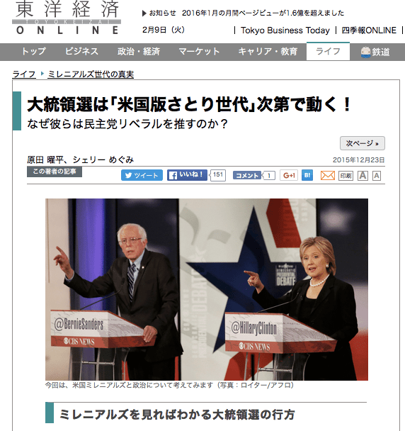 ベースになっている東洋経済オンラインの記事は以下です。去年12月に掲載されたものですが、もっと詳しく知りたい方もぜひお読みください。 Continue reading [Radio]大統領選を変えるミレニアルズとは? TOKYO FM TIMELINE
