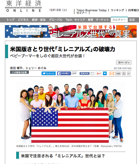 かつてのアメリカのイメージを覆す巨大な世代グループが、アメリカ人口の4分の1を擁する「ミレニアルズ世代」。18〜35歳のパワフルなグループはアメリカをどう変えているのか? Continue reading 東洋経済オンライン10月19日: 米国版さとり世代「ミレニアルズ」の破壊力 ベビーブーマーをしのぐ超巨大世代が台頭!