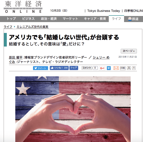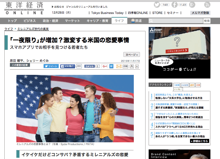 「一夜限り」が増加?激変する米国の恋愛事情 スマホアプリでお相手を見つける若者たち Continue reading ミレニアルズ3回目(結婚編)東洋経済オンライン2015年11月17日: アメリカでも「結婚しない世代」が台頭する 結婚するとして、その意味は「愛」だけに?