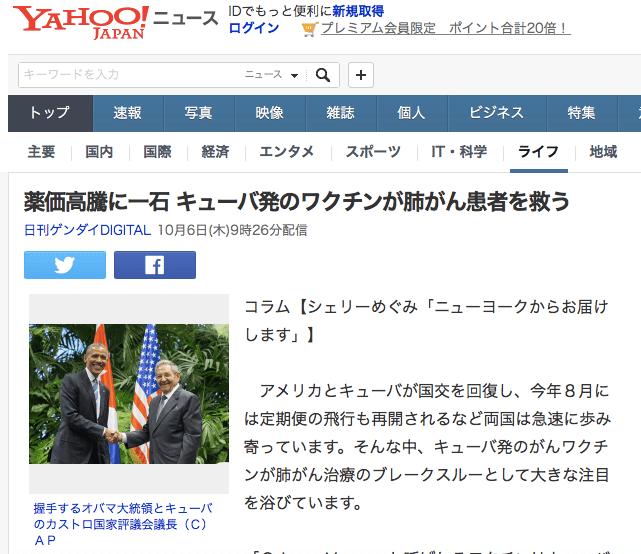 厳しい経済制裁下のキューバで開発された肺がんワクチンが世界で注目されています。The vaccine is the result of a 25-year research project in Cuba and very inexpensive. Continue reading [Health]ニューヨークからお届けします 薬価高騰に一石 キューバ発のワクチンが肺がん患者を救う Cuba’s Lung Cancer Vaccine Heading to the US