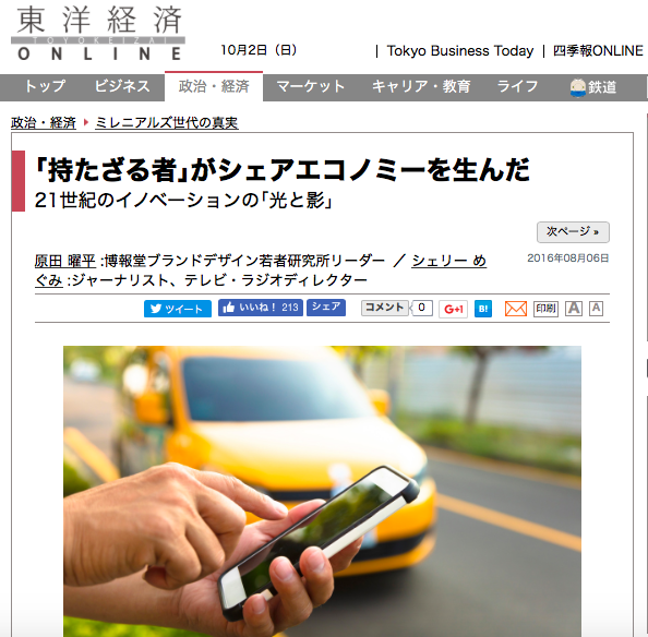 2016年の大統領選に大きな影響を与えているミレニアルズをあらゆる角度から分析しています。日本の社会とどこが似ていてどう違うのか、これからの消費経済の潮流を読み解くヒントにもなります。ぜひご一読ください。 Continue reading 東洋経済ONLINE2016年8月6日「持たざる者」がシェアエコノミーを生んだ 21世紀のイノベーションの「光と影」