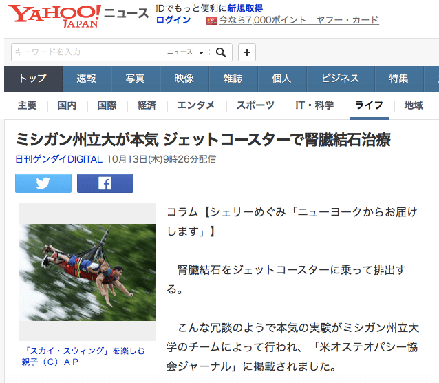 [日刊ゲンダイ連載ニューヨークからお届けします 10.13.2016掲載]以こういう研究を本気をやるアメリカが私は好きです。 Continue reading [Health] ミシガン州立大が本気 ジェットコースターで腎臓結石治療 Can a Roller Coaster Help You Pass a Kidney Stone?