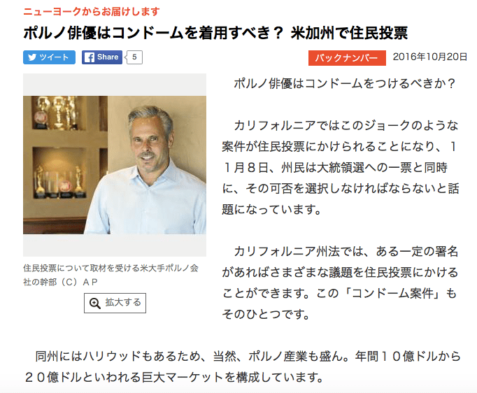 2016年の大統領選、誰に投票するか悩ましい有権者も多い中、カリフォルニア州民はこんな住民投票までしなければなりません。Too much democracy? On Nov. 8, Californian voters must choose yes or no to mandatory condoms for adult film actors.日刊ゲンダイのコラム「ニューヨークからお届けします」のキャッチアップ from Nikkan-Sendai Article. Continue reading [Health]マジ?カリフォルニア州の住民投票「ポルノ俳優はコンドームを着用すべき?」Californians Vote for Condoms or Not on Nov. 8