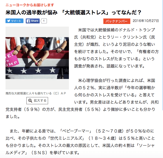 アメリカ人の過半数が大統領選にストレスを感じています。特に若いミレニアル世代ほどストレスが多いそう。またアメリカ人の4割が大統領選のおかげで家族や友達と緊張関係にあると答えているそうです。More than half of Americans are stressed out by Presidential election this year. The younger generations like Millennials are affected more. Also, nearly 40% Americans report tension with family or friends. Continue reading [Health]アメリカ人の過半数が悩む大統領選ストレスとは?More than half of Americans Are Stressed Out….by Presidential Election