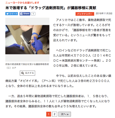 アメリカではヘロインやオピオイド系の鎮痛剤などドラッグ過剰摂取で死亡する人が増えて社会問題になっています。ところがそのおかげで臓器移植を受けられる人が増えるという現象をアメリカ人は複雑な気持ちで受け止めています。While drug overdose death increases, more patients are recieving the donated organs. Continue reading [Health]アメリカで激増する「ドラッグ過剰摂取死」が臓器移植に貢献