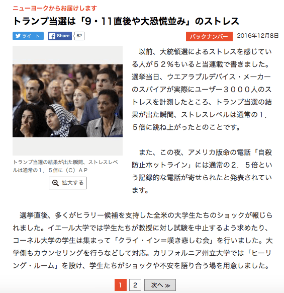 トランプ当選以来のストレスについて書いた日刊ゲンダイの記事です。 これは主に当選直後のストレスについてで、身に覚えがある人も多いと思います。 実は今もっと深刻なストレスが問題になっています。 全米に住む移民の子供たちが抱えるストレスです。この続きは後ほどアップします。 Did you know how much Americans are stressed by the election result? Yeah…pretty much according to the surveys. 続きは日刊ゲンダイのコラム「ニューヨークからお届けします」で。 リンクをクリックしてお読みください。 トランプ当選は「911・大恐慌並みのストレス」12/08/2016 Continue reading [Health]トランプ当選は「911・大恐慌並みのストレス」How Much Are Americans Stressed by Election Result?