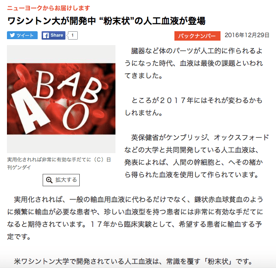 ユニークな医療ブレイクスルーが2017年に大きく期待されています。 続きは日刊ゲンダイのコラム「ニューヨークからお届けします」で。 リンクをクリックしてお読みください。 ワシントン大が開発中 “粉末状”の人工血液が登場 12/29/16 75%のマウスが記憶回復 アルツハイマー治療に大きな進歩01/03/2017 Continue reading [Health]2017年期待の医療ブレイクスルー:スーパーブラッド&超音波アルツハイマー治療