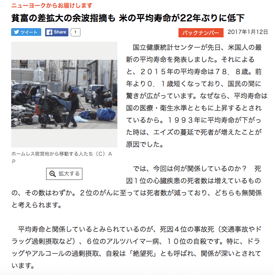 日刊ゲンダイ「ニューヨークからお届けします」の最新記事です。アメリカの2015年の平均寿命は22年ぶりに低下しました。その理由は一体なんでしょうか? US Life Expectancy Declined For The First Time Since 1993. But why? Continue reading [Health]貧富の差拡大の余波指摘も 米の平均寿命が22年ぶりに低下 US Life Expectancy Declines For The First Time Since 1993
