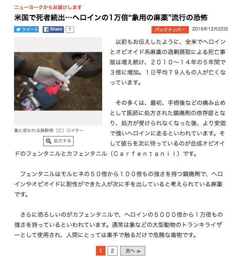 ピオイド系の処方薬の依存症→ヘロイン中毒→合成オピオイド麻薬とエスカレートする中で、過剰摂取による事故死は全米で社会問題となっています。Drug Overdose Deaths Are Increasing Due To Opioid Carfentanil, Elephant Tranquilizer. Continue reading [Health]米国で死者続出…ヘロインの1万倍“象用の麻薬”流行の恐怖 Drug Overdose Deaths Are Increasing Due To Opioid Carfentanil, Elephant Tranquilizer